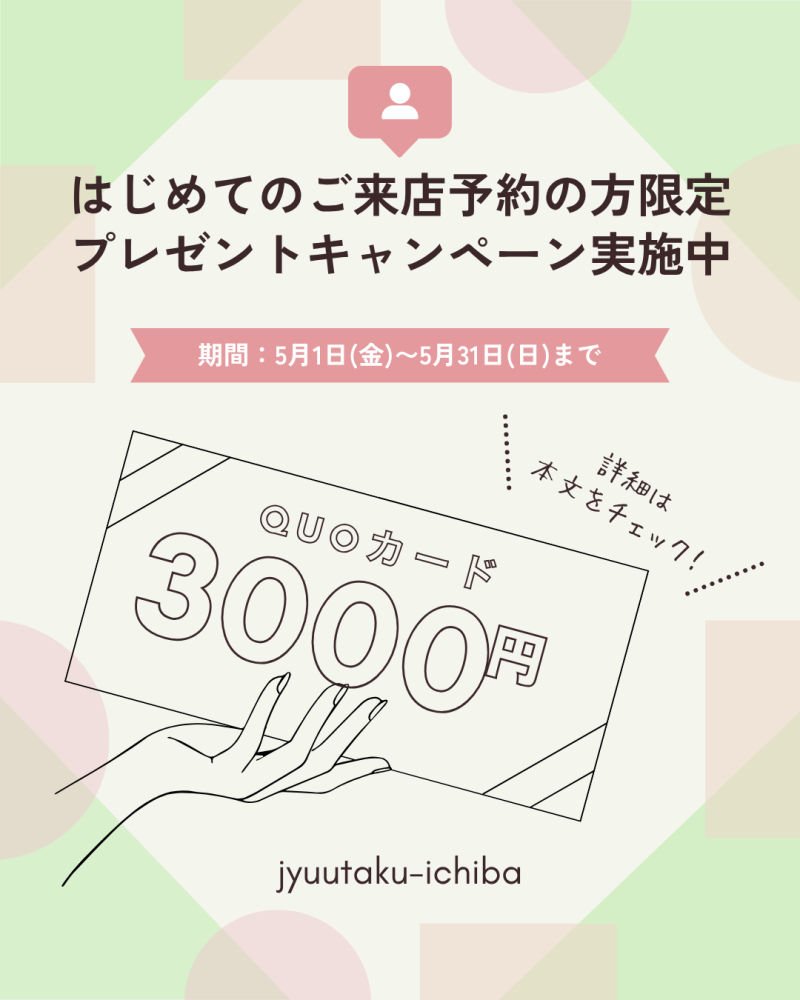 はじめて住宅市場へお問い合わせ・ご来店いただくお客様を対象に、クオカード3,000円分をプレゼントいたします。